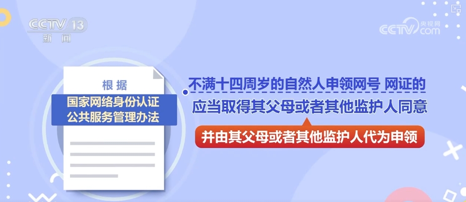 根據《國家網絡身份認證公共服務管理辦法》,不滿十四周歲的自然人申領網號、網證的,應當取得其父母或者其他監護人同意,並由其父母或者其他監護人代為申領。已滿十四周歲未滿十八週歲的自然人申領網號、網證的,應當在其父母或者其他監護人的監護下申領。