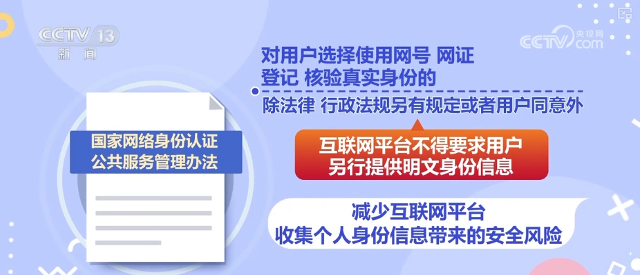 《管理辦法》嚴格依照《個人信息保護法》等法律規定,充分保障公民個人信息權益。對用户選擇使用網號、網證登記、核驗真實身份的,除法律、行政法規另有規定或者用户同意外,互聯網平台不得要求用户另行提供明文身份信息,從而減少互聯網平台收集個人身份信息帶來的安全風險。同時,《管理辦法》也明確,國家網絡身份認證公共服務平台應當按照“最小必要”原則收集信息,所收集的信息僅限網絡身份認證所必要的信息,不得收集其他信息。