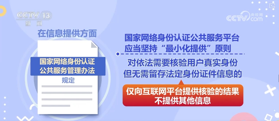 在信息提供方面,《管理辦法》規定,國家網絡身份認證公共服務平台應當堅持“最小化提供”原則,對依法需要核驗用户真實身份但無需留存法定身份證件信息的,僅向互聯網平台提供核驗的結果,不提供其他信息。對依法確需獲取、留存用户法定身份證件信息的,經用户單獨同意,公共服務平台可以向互聯網平台提供必要的明文身份信息。