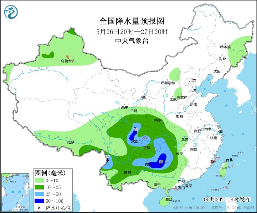 *5月25日20時至26日20時,*西南地區南部、廣西西北部、西藏東南部、台灣島中北部等地部分地區有中到大雨,其中,雲南西南部等地局地有暴雨(50~75毫米)(見圖2)。