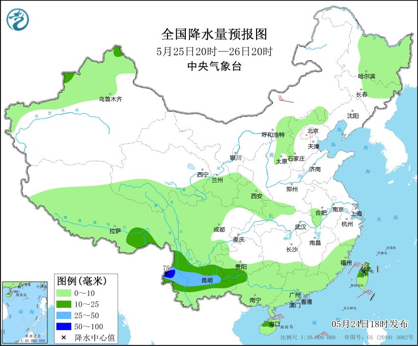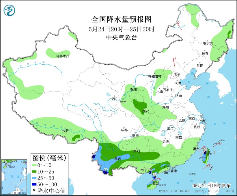 *5月24日20時至25日20時,*西藏地區東南部、黑龍江東部、雲南大部、貴州南部、廣西北部和東南部沿海、廣東西南部沿海、台灣島大部等地部分地區有中到大雨,其中,雲南西部和西南部、廣西東南部沿海、廣東西南部沿海、台灣島中北部等地部分地區有暴雨(50~80毫米)。內蒙古東部部分地區有4~5級風(見圖1)。