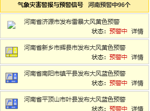 大象新聞記者5月22日從河南氣象瞭解到,今天白天到夜裏,全省多雲轉陰天,有小到中陣雨、雷陣雨,鄭州南部、許昌、平頂山東部、漯河、商丘、周口、駐馬店、南陽、信陽部分縣市有大到暴雨,局部大暴雨,並伴有短時強降水、雷暴大風等強對流天氣。全省偏北風4級左右,陣風7級左右,局部9到10級。最高氣温:西部、北部23到25度;東部、南部33到35度;其他縣市28到30度。最低氣温:全省12到14度。 截至早上6點50,河南96個大風、高温等預警信號生效中。