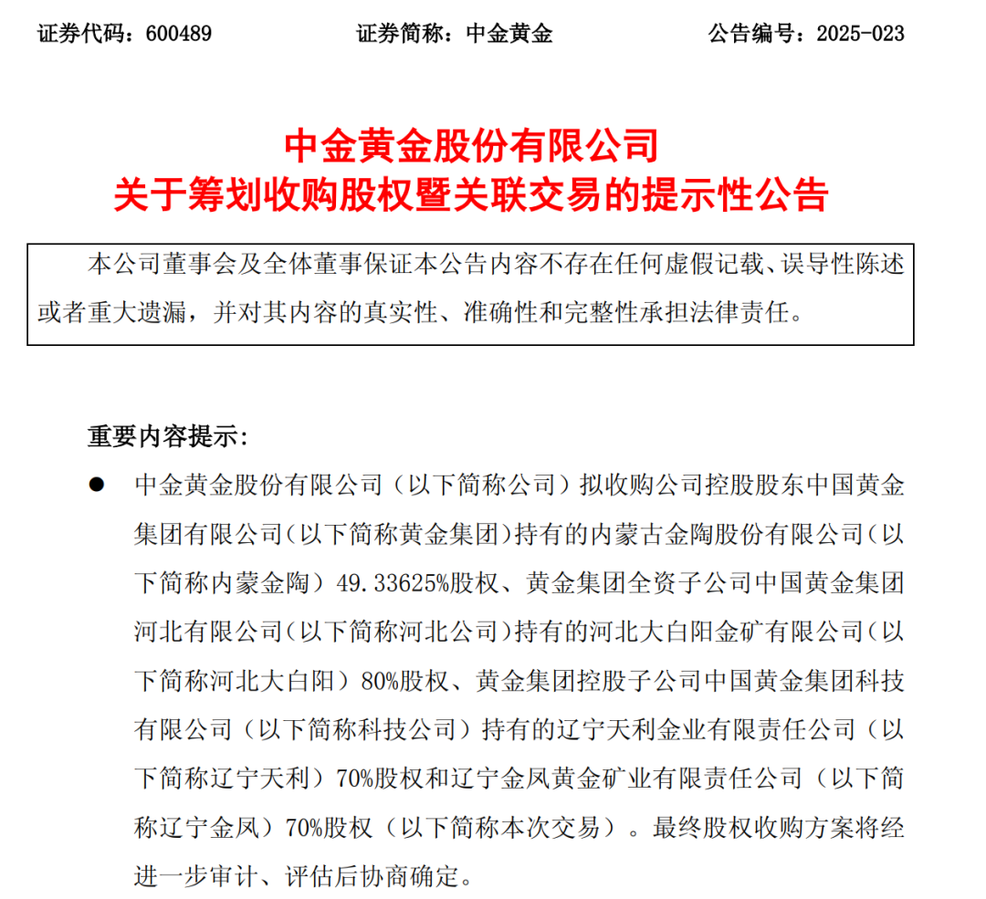 具體而言,中金黃金擬收購黃金集團持有的內蒙金陶49.33625%股權、黃金集團全資子公司河北公司持有的河北大白陽80%股權,以及黃金集團控股子公司科技公司持有的遼寧天利70%股權和遼寧金鳳70%股權。