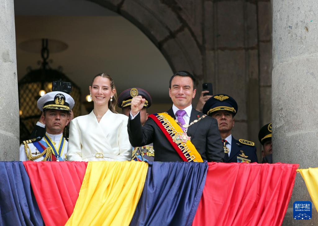 5月24日,在位於厄瓜多爾首都基多的總統府,厄瓜多爾當選總統丹尼爾·諾沃亞攜妻子向民眾致意。新華社發(厄瓜多爾總統府供圖)
