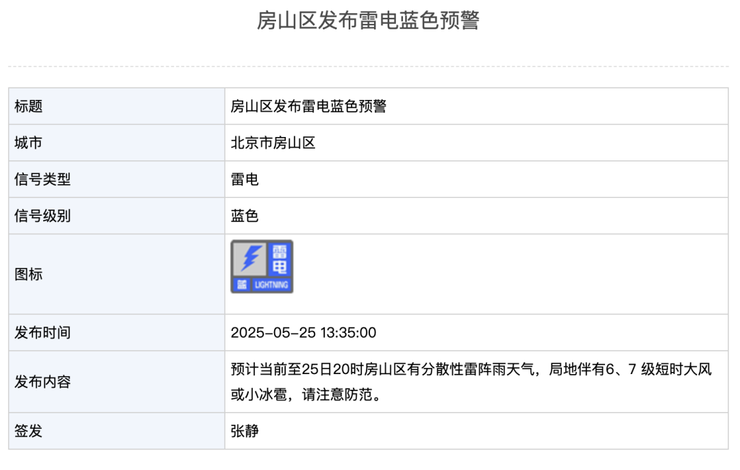 5月25日13時35分,房山區發佈雷電藍色預警:預計當前至25日20時房山區有分散性雷陣雨天氣,局地伴有6、7 級短時大風或小冰雹,請注意防範。