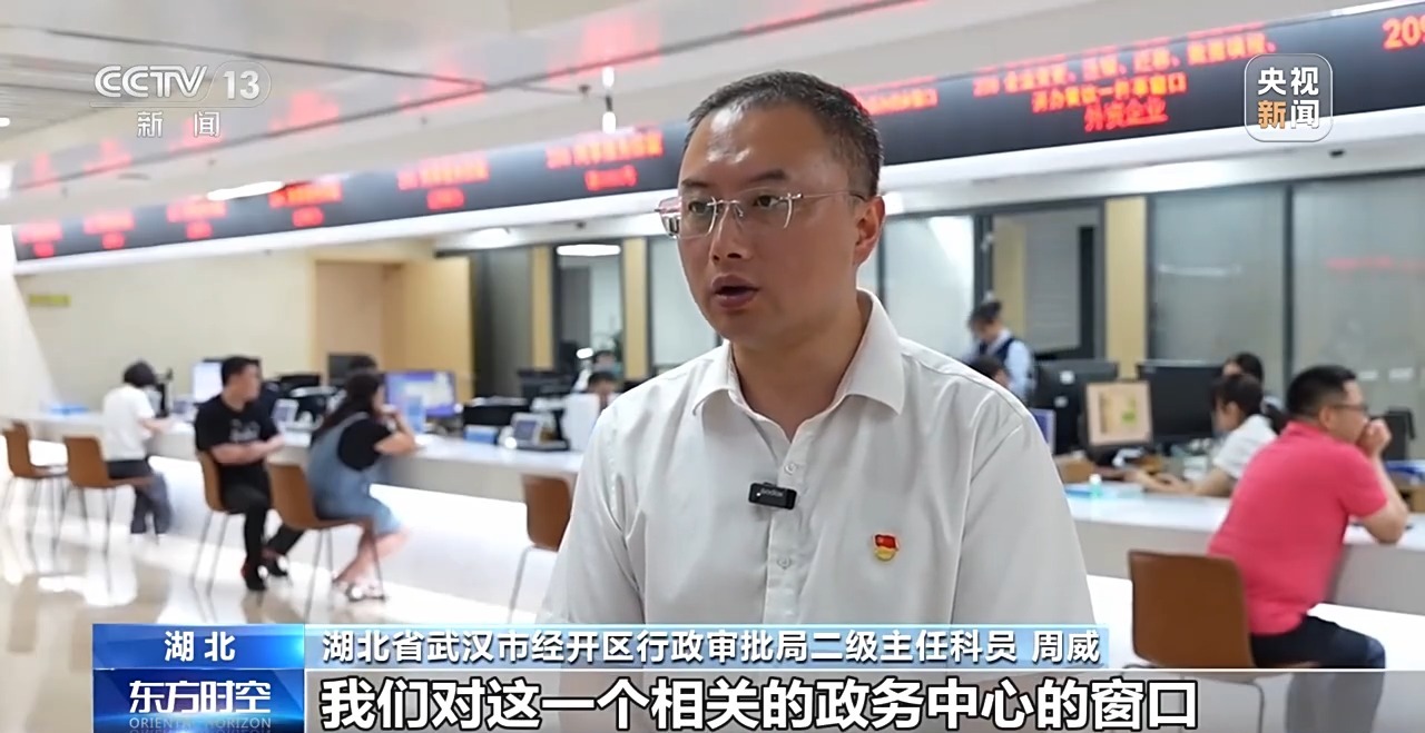*湖北省武漢市經開區行政審批局二級主任科員 周威:*我們對這一個相關的政務中心的窗口,企業登記、税務,企業遷移、內資外資,以及食品藥品等(業務辦理)全部集中在這一層。相當於企業一天之內,可以把所有的事情辦完,不需要企業再跑腿,後台內部來進行流轉就可以了。