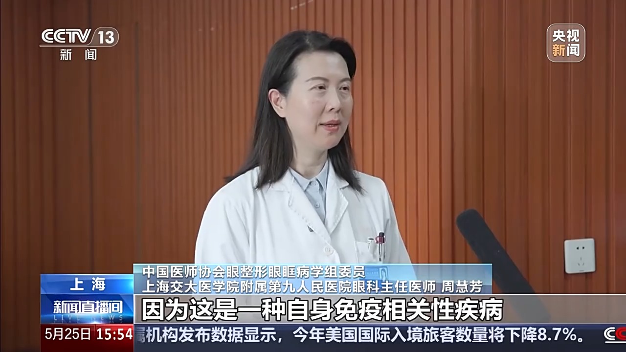*中國醫師協會眼整形眼眶病學組委員、上海交大醫學院附屬第九人民醫院眼科主任醫師 周慧芳:*因為這是一種自身免疫相關性疾病,也就是説我們甲狀腺和眼睛球后的這些組織,它會有一些共同的抗原存在,所以當自身免疫狀態被打破了以後,這兩個器官會同時跟這個自身抗體結合而產生疾病,所以這種疾病是會累及到兩個器官的一種疾病。