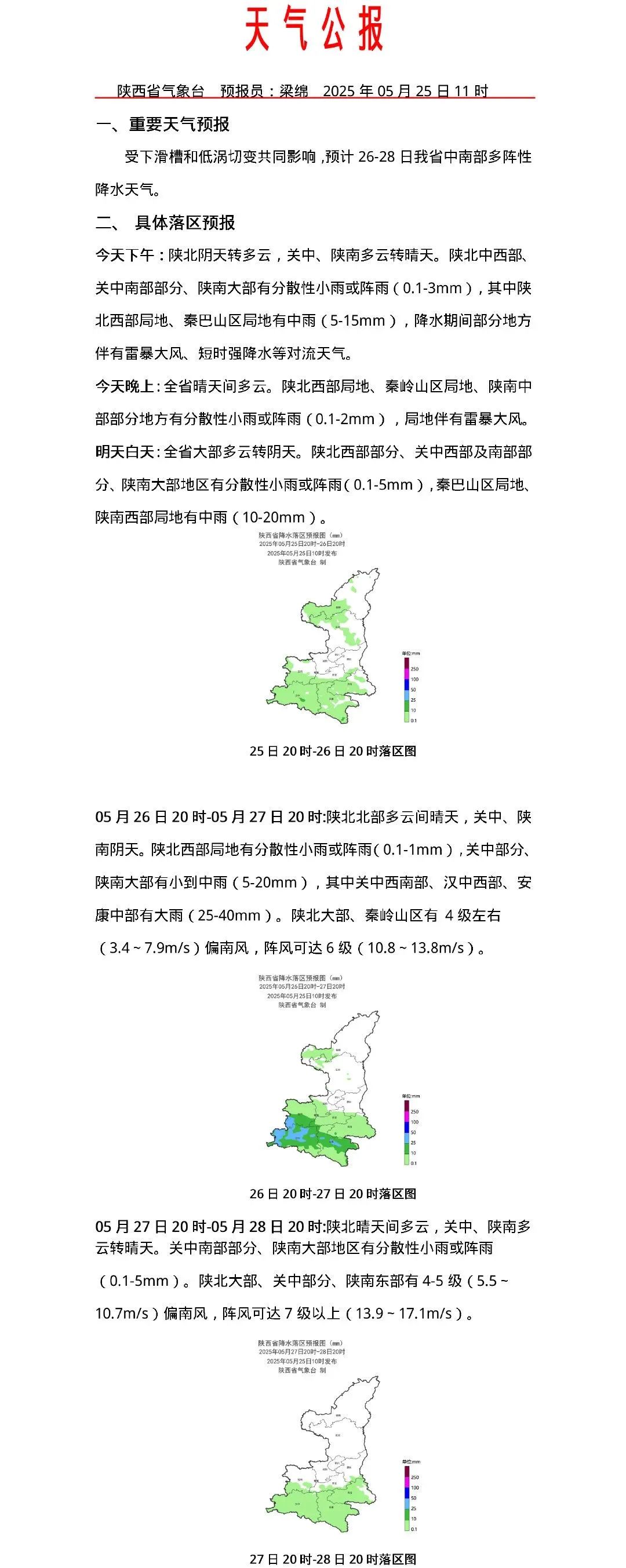 預計26日夜間至27日降水為雷陣雨或小雨,其餘時間以多雲到陰天氣為主。26-27日最高氣温維持在26~28℃,28日起將升至30℃以上。另外,28日-30日多吹風天氣,31日起西安市將進入多雨時段。