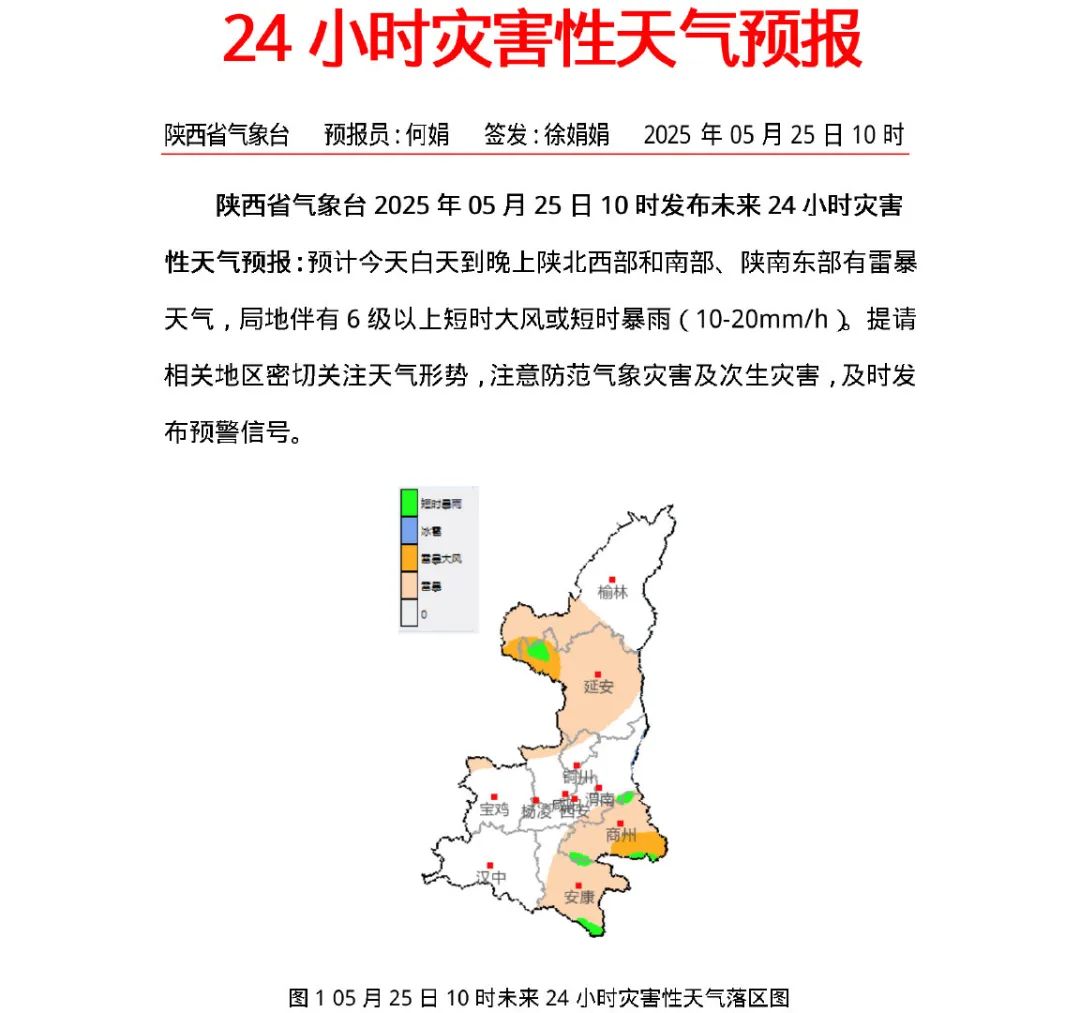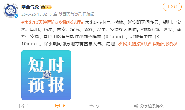 未來0-6小時:榆林、延安陰天間多雲,銅川、寶雞、咸陽、楊凌、西安、渭南、商洛、漢中、安康多雲間晴。榆林南部、延安、商洛、安康、秦巴山區有分散性小雨或陣雨(0-5mm),局地有中雨(3-10mm)。