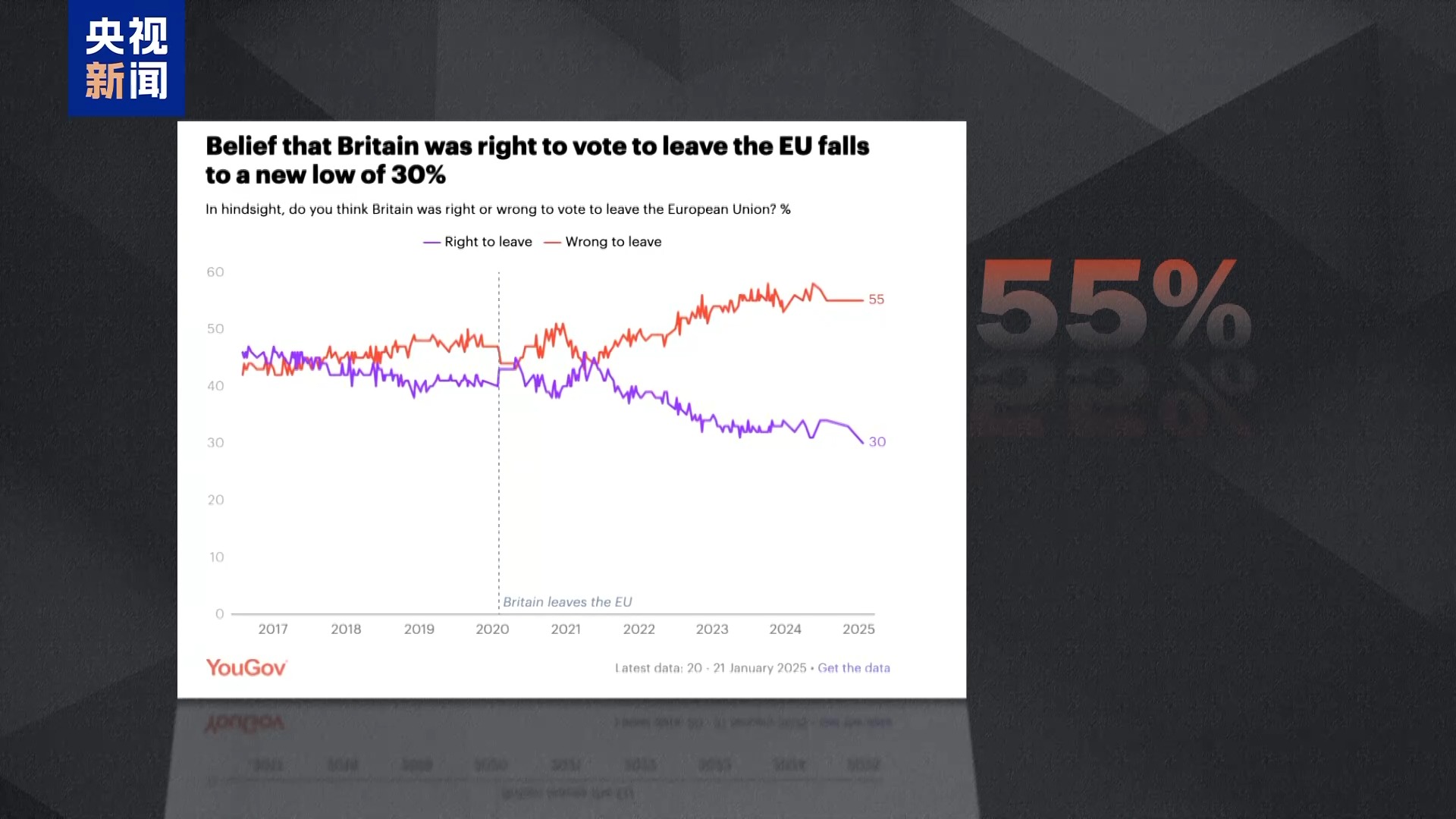 今年1月,在英國“脱歐”五週年之際,民調機構輿觀(YouGov)的調查數據顯示,高達55%的受訪者認為英國“脱歐”是一個“錯誤”,只有約30%的人認為英國通過公投“脱歐”是正確之舉。