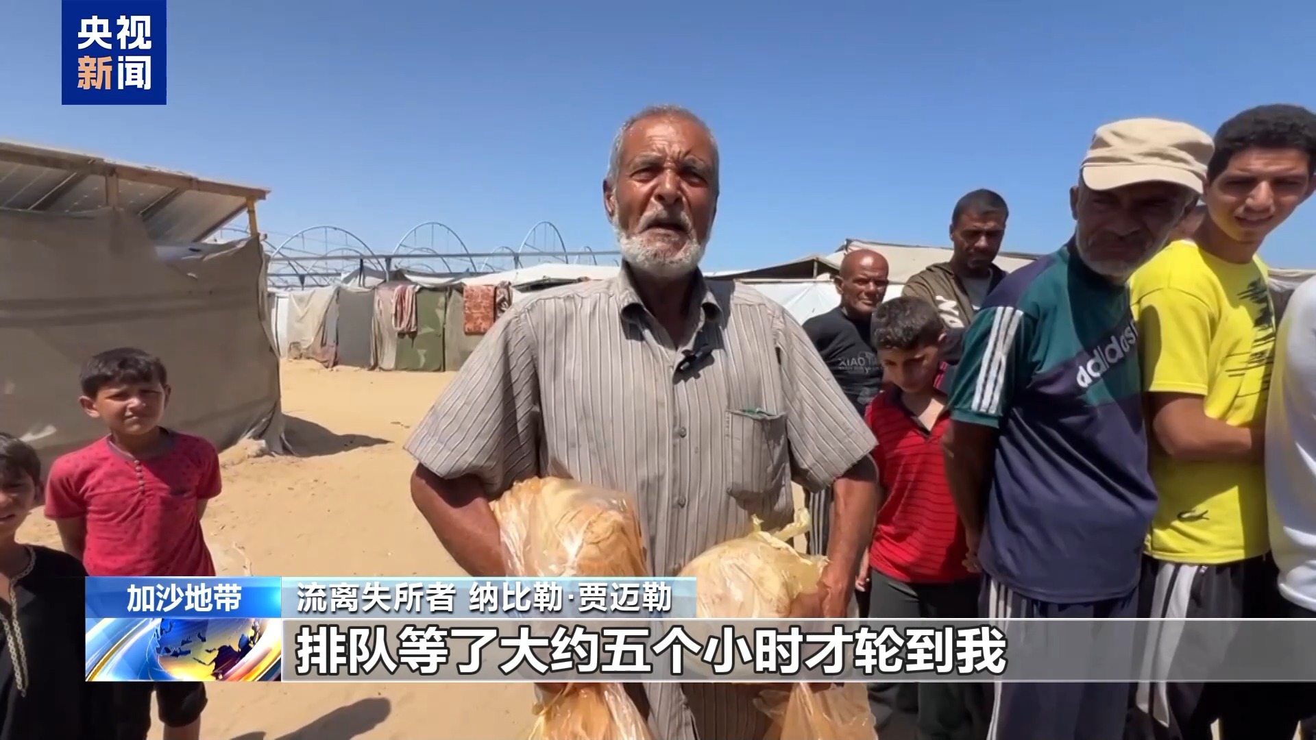 *流離失所者 納比勒·賈邁勒:*我年紀大了,排隊等了大約五個小時才輪到我。我們親戚間上上下下有11户家庭,但領到的大餅連一頓飯都不夠。