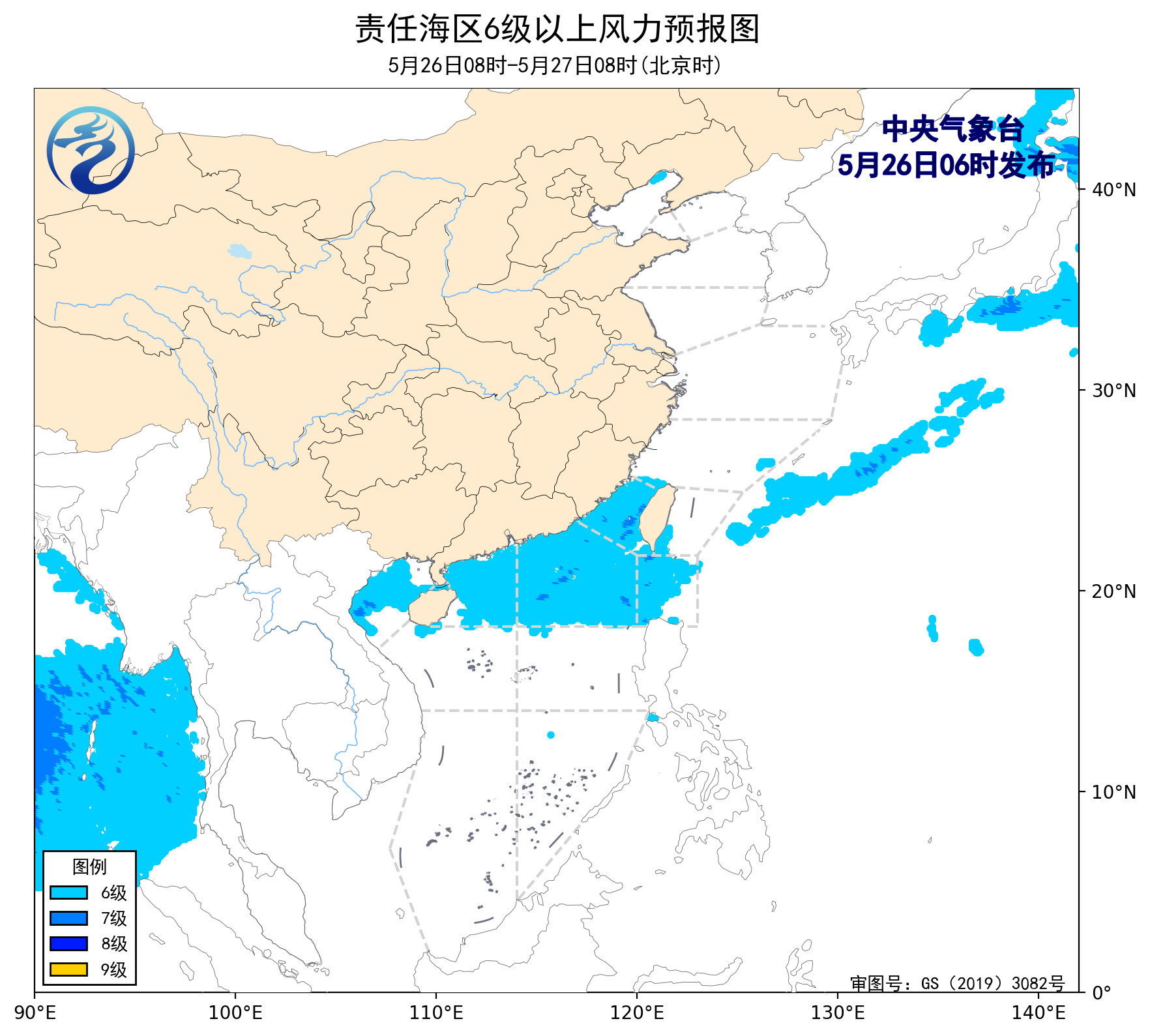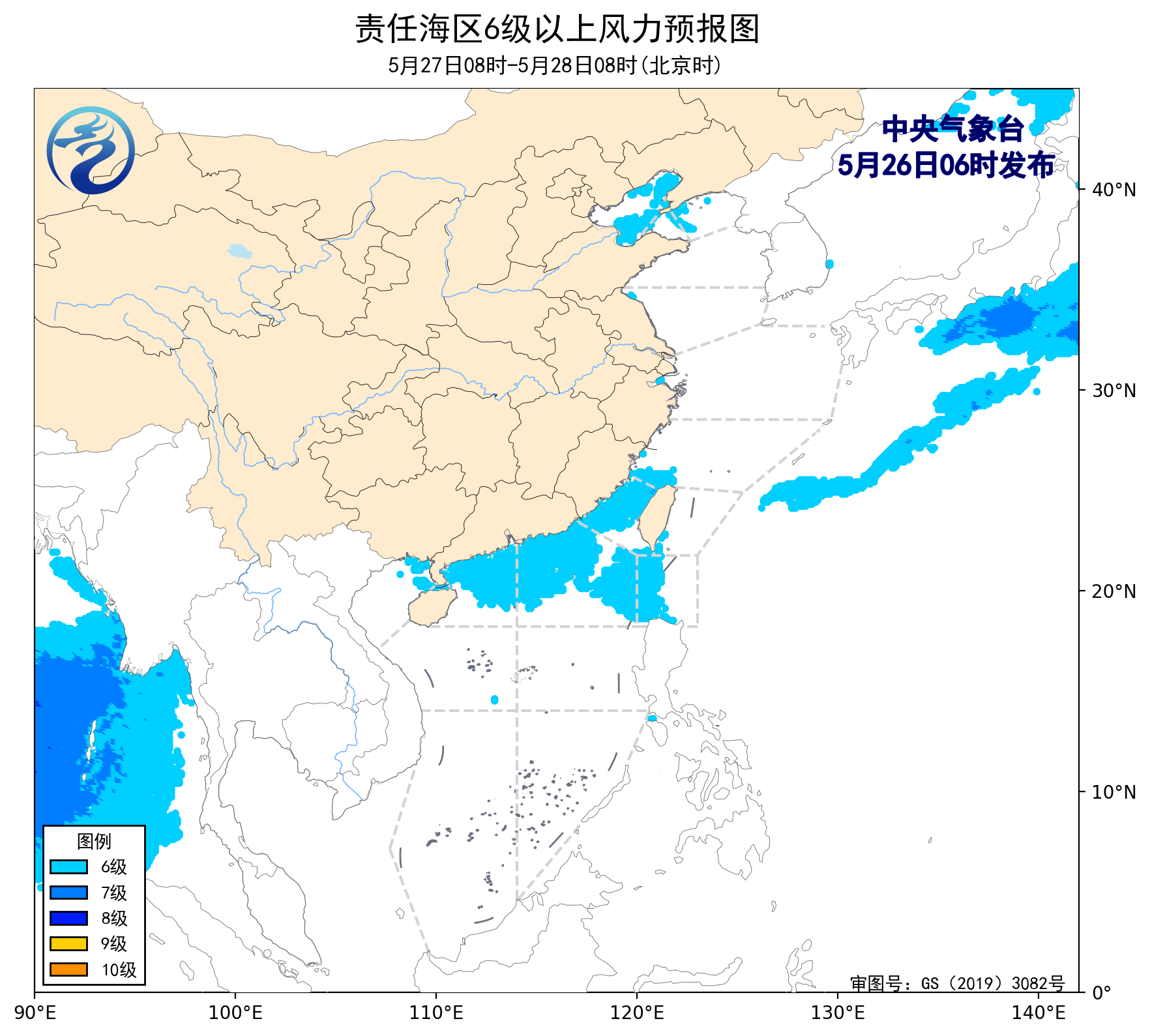 26日08時至27日08時,台灣海峽、巴士海峽、北部灣、瓊州海峽、南海北部海域將有5~6級、陣風7級的偏東到東北風。