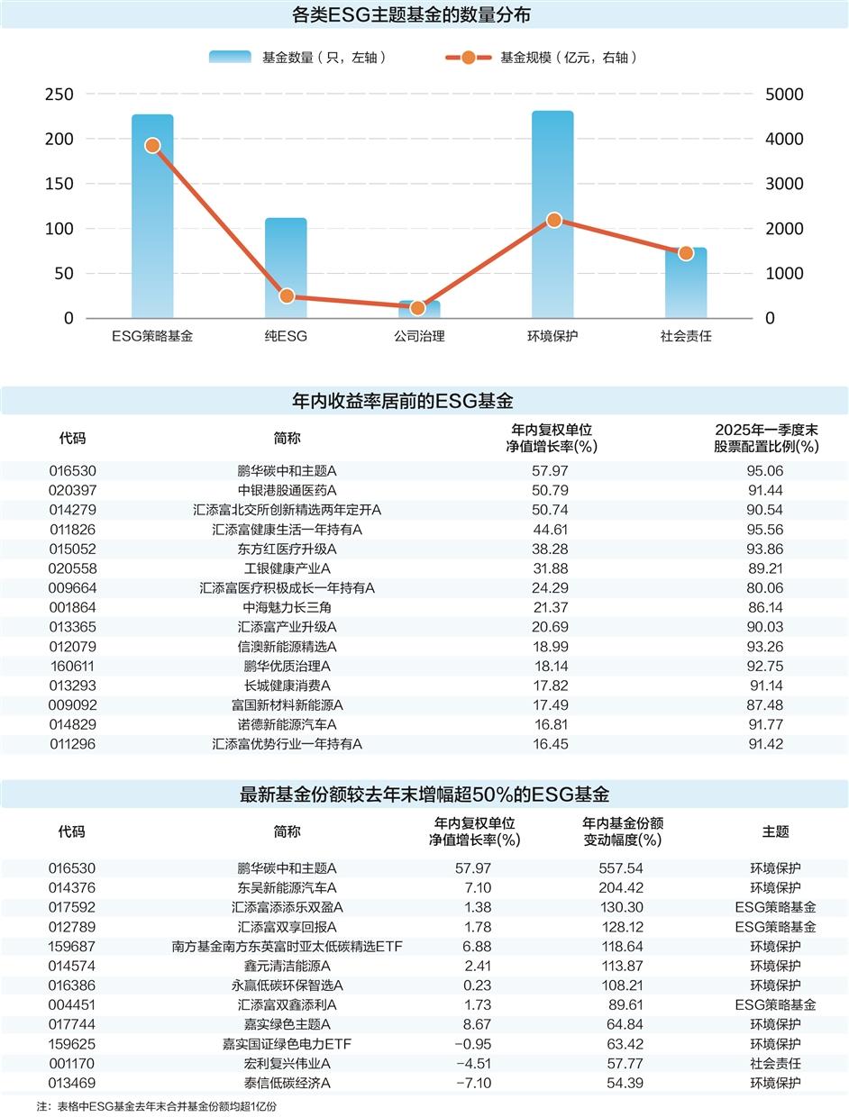 具體來看,2024年末基金份額超1億份,最新基金份額較去年末增幅超50%的ESG基金有12只,7只增幅超過100%。