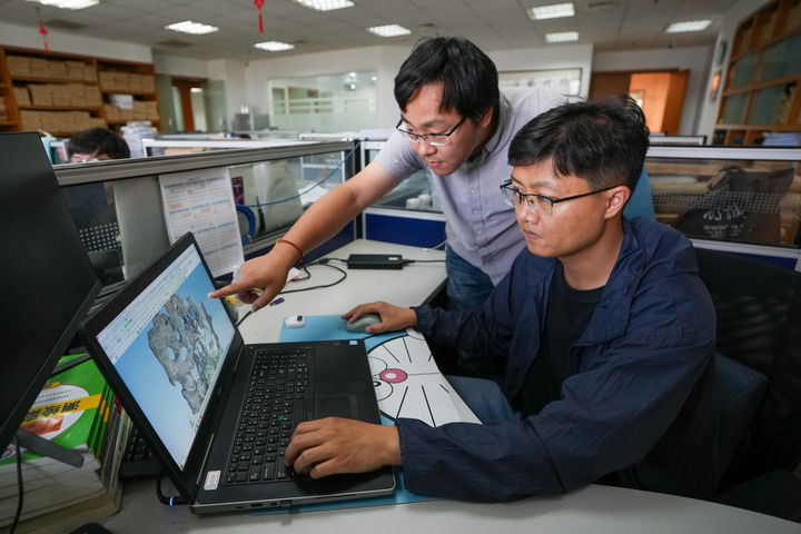 工作人員通過軟件處理蘇州環秀山莊的數字場景掃描數據(2025年5月19日攝)。新華社記者 李博 攝