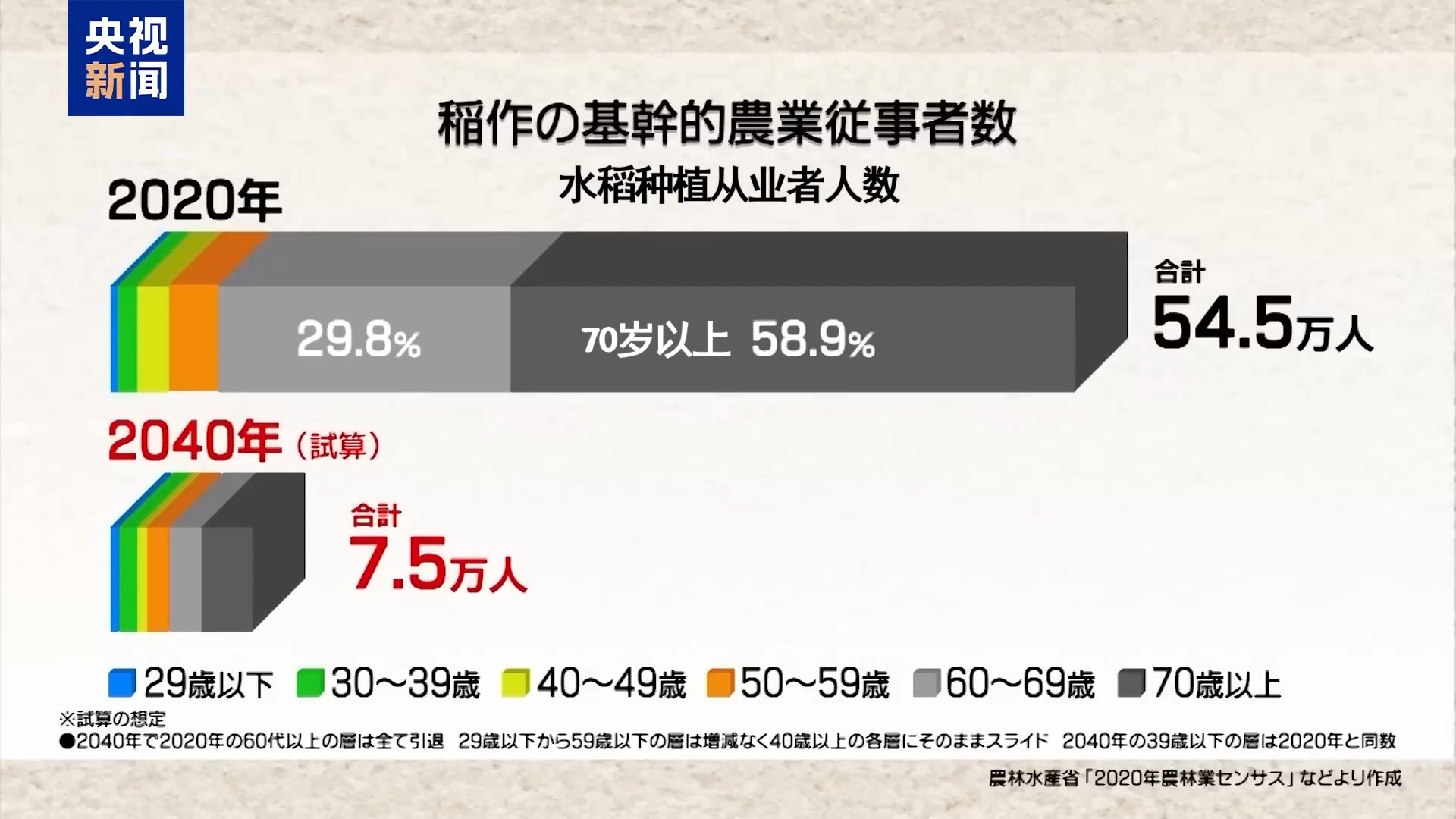 今年2月國會眾議員討論會上公佈的數據則證實,日本農民平均年齡已超70歲,再過5到10年,農户數量將急劇減少,屆時大米價格可能飆升至每5公斤1萬至2萬日元。而到2040年,農户數量預計將進一步驟減。