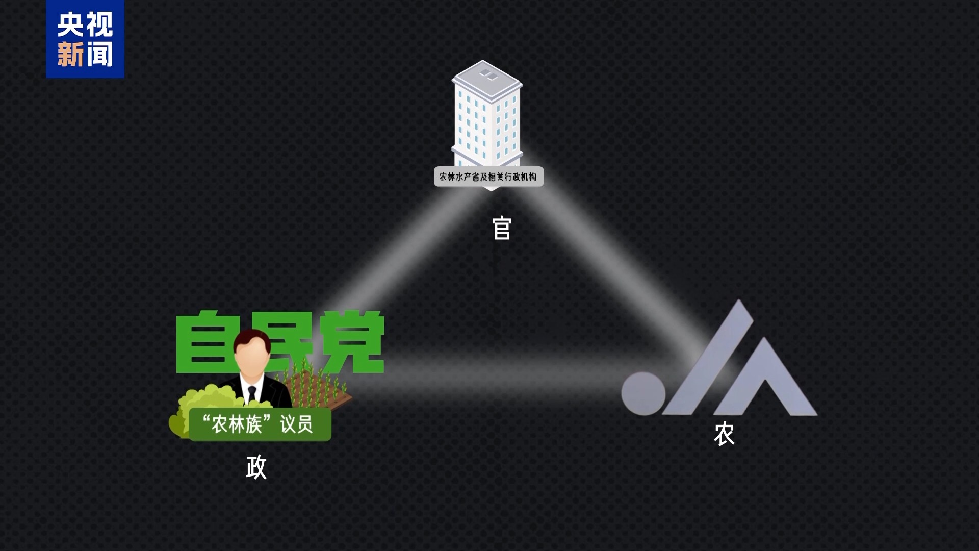 據《讀賣新聞》報道,如今日本全國農業協同組合聯合會,即“日本農協”左右着日本國會約30%的席位,在歷次重大選舉活動中,農協都會動員旗下農民向自民黨貢獻大量選票,而農協長期與自民黨內“農林族”議員合作,影響相關立法及農林水產省的政策走向,形成一個*“政—官—農”權力三角*。