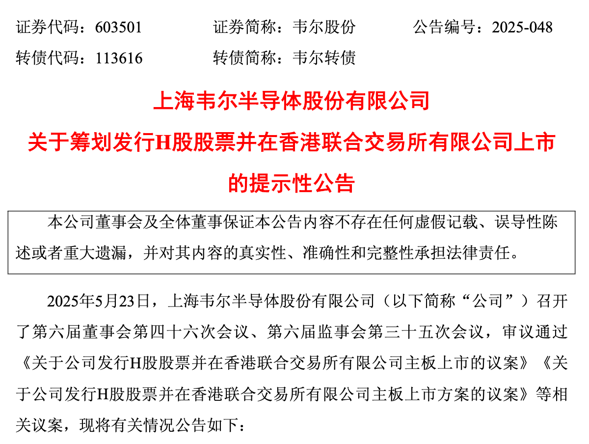 【環球網財經綜合報道】5月24日,韋爾股份(603501.SH)發佈重磅公告,擬發行H股並在香港聯交所主板上市。若此次H股上市成功,A+H兩地上市的半導體企業將再添一員,行業格局或迎新變局。