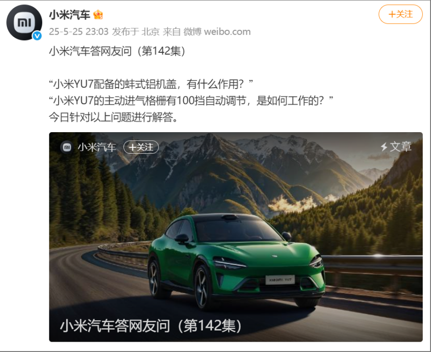 【環球網科技綜合報道】5月26日消息,針對“小米YU7主動進氣格柵100擋自動調節如何工作”的問題,小米汽車回應網友稱,在全關閉狀態下,它可以降低整車風阻係數18 Counts,最高可以提升14km的續航里程。