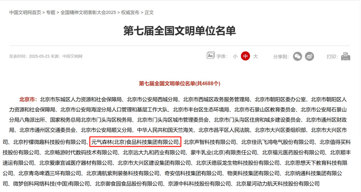 5 月 23 日,在全國精神文明建設表彰大會上,北京朝陽區民營科技企業元氣森林股份有限公司榮獲第七屆 “全國文明單位” 稱號。作為國內飲料行業的創新代表,該企業以企業文化建設為根基、以社會責任擔當為底色、以創新發展實踐為引擎,為民營企業精神文明建設樹立了典範。