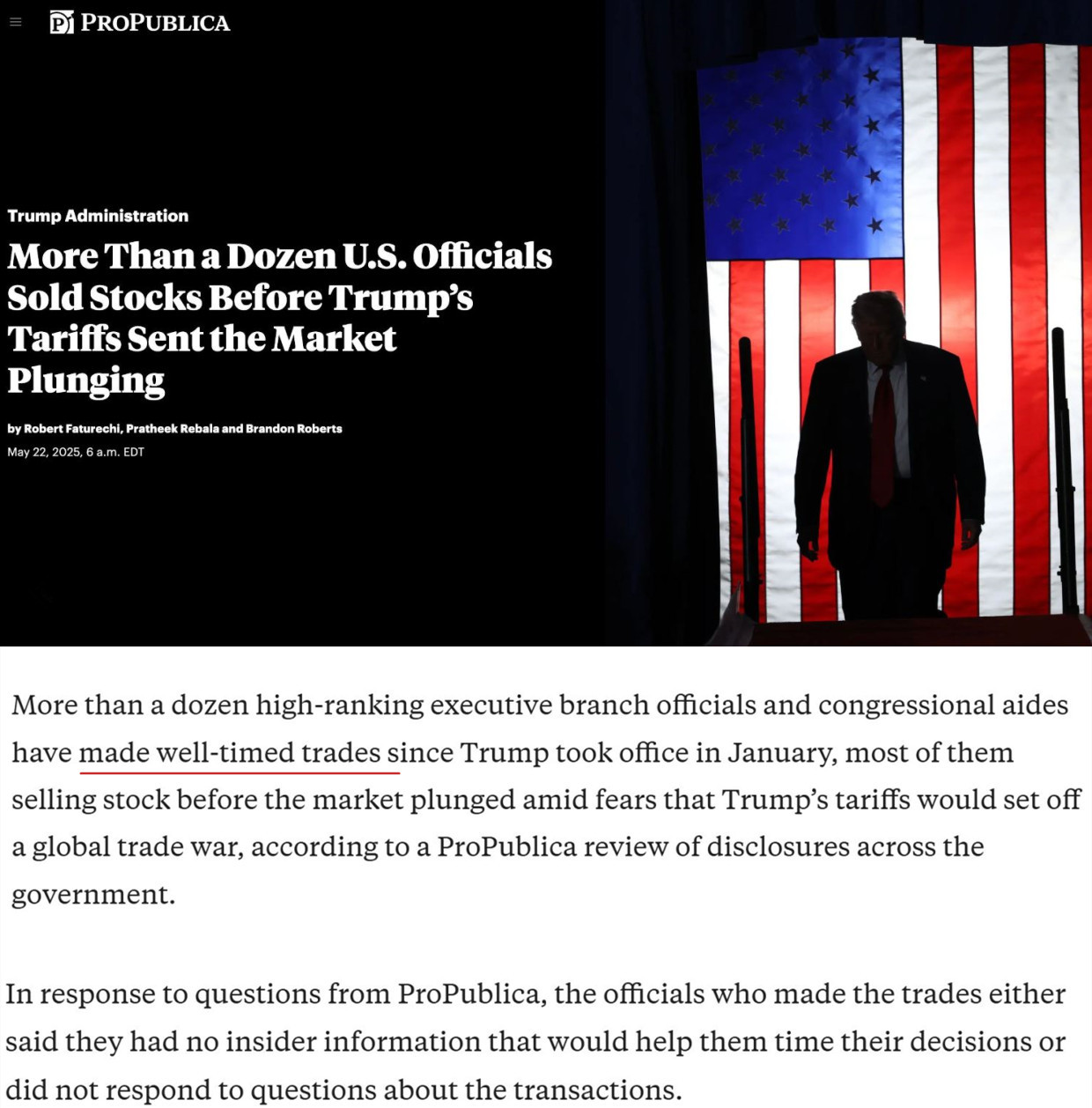 最近,美國“專業公眾”新聞調查網站在查詢了數百份證券交易披露報告後發現,自本屆美國政府1月上台以來,有十幾名美國政府高級官員、國會工作人員乃至國會議員進行了時機“恰到好處”的交易,其中大部分人在美國關税政策導致市場暴跌之前拋售了股票;還有人則在相關法案獲批前“及時”購買了該法案所利好的行業公司股票。