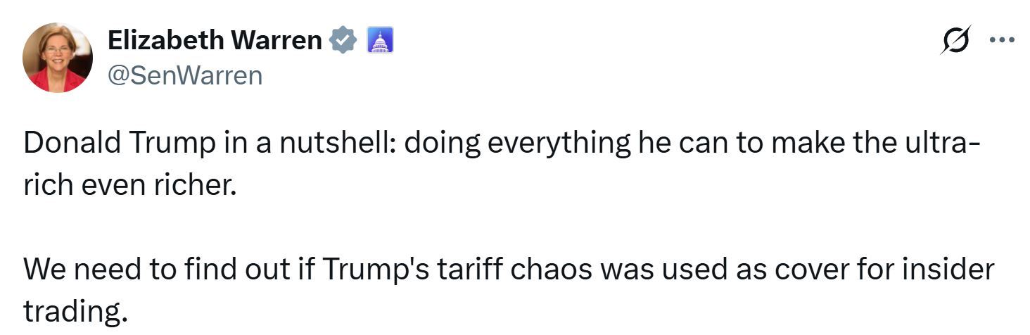 美國民主黨籍聯邦參議員伊麗莎白·沃倫表示,鑑於特朗普政府正盡一切可能讓美國富人們更加富有,有必要弄清楚白宮製造的關税混亂是否被用作內幕交易的掩護。