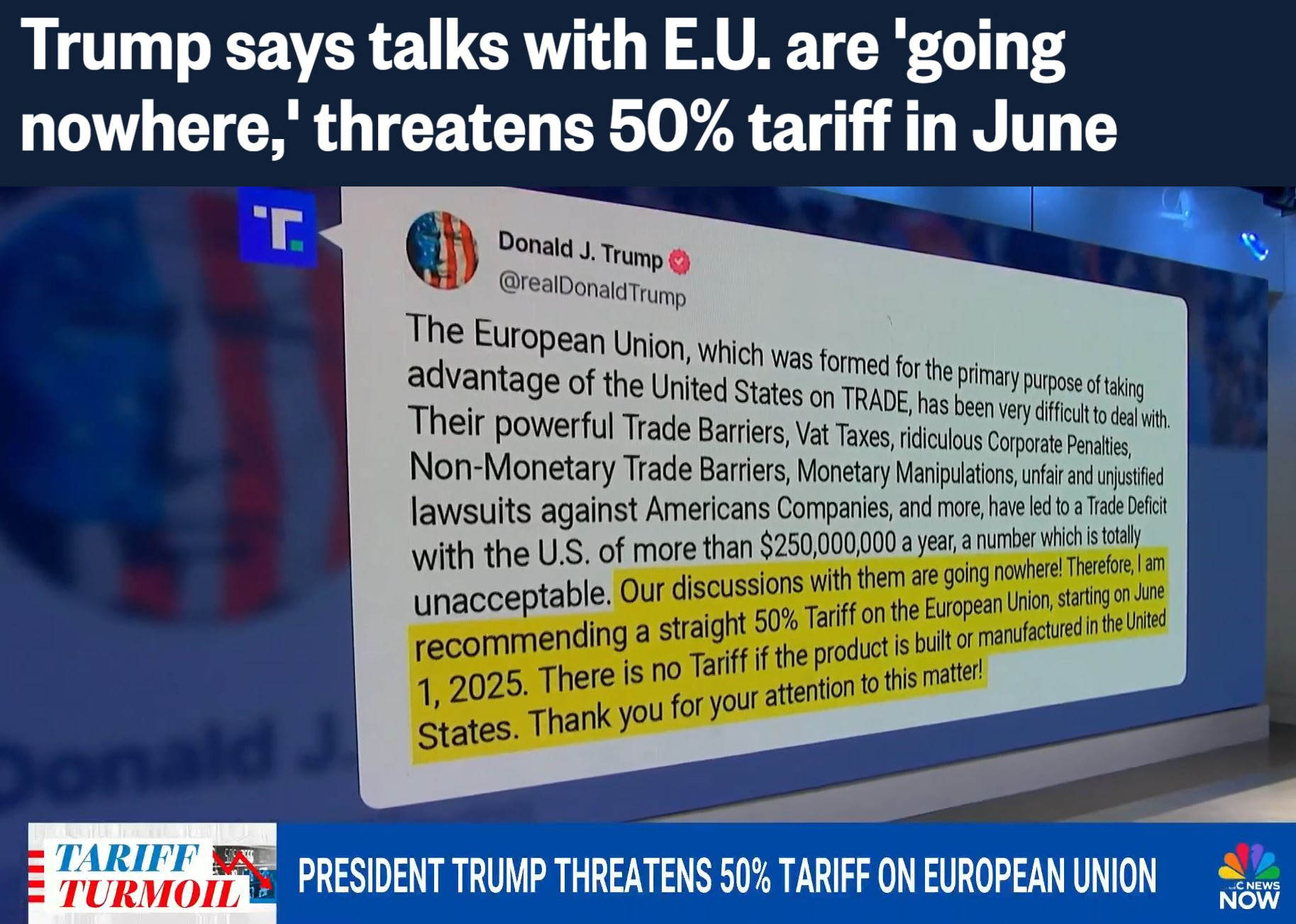 美國總統特朗普23日在社交媒體發文威脅稱,由於美國與歐盟的談判“毫無進展”,他建議從6月1日起對來自歐盟的商品徵收50%的關税。