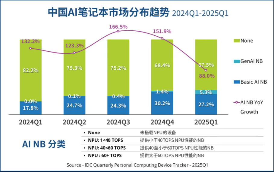 【環球網科技綜合報道】5月26日消息,IDC最新數據顯示,2025年一季度(25Q1),搭載40TOPS及以上NPU(算力)的筆記本電腦出貨量顯著增長,達到24.1萬台,佔中國筆記本電腦市場出貨量的5.3%。上季度份額為1.4%。