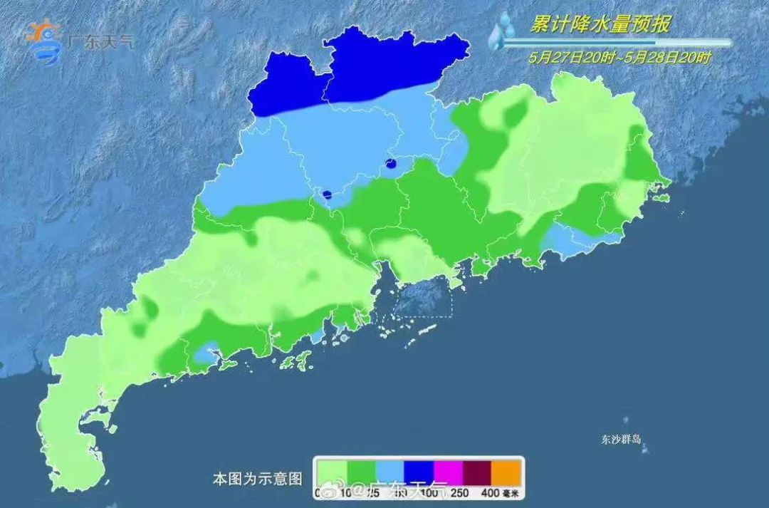 廣東省氣象台預計,26日至27日,廣東大部多雲到陰天,部分市縣有陣雨。按現有氣象資料預計,28日至29日,廣東自北向南有一次暴雨局部大暴雨降水過程,局地伴有8級左右短時大風。