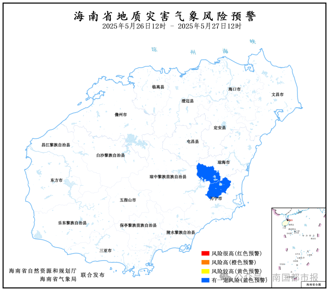 海南省自然資源和規劃廳、海南省氣象局2025年5月26日12時聯合發佈地質災害氣象風險預警:根據海南省氣象局前期降雨實況和未來24小時降雨預報,結合地質環境條件背景,預計未來24小時(2025年5月26日12時至2025年5月27日12時)瓊海市會山鎮、萬寧市北大鎮降雨誘發地質災害有一定風險,為Ⅳ級風險預警(藍色預警)。藍色預警區內人員,請隨時關注預警信息變化,注意附近警示標誌,避免在溝谷、斜坡、陡崖(坎)等高風險地帶逗留。