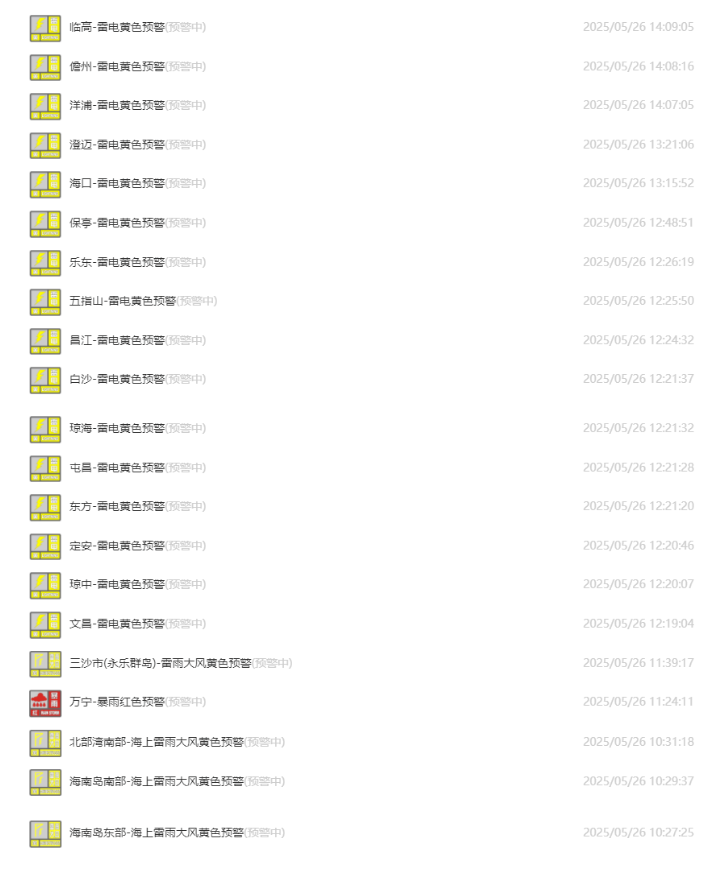 瓊海市氣象台2025年05月26日12時21分發佈雷電黃色預警信號:瓊海市12時30分到20時可能發生雷電活動,可能會出現雷電災害事故,建議有關單位和人員做好防範工作。