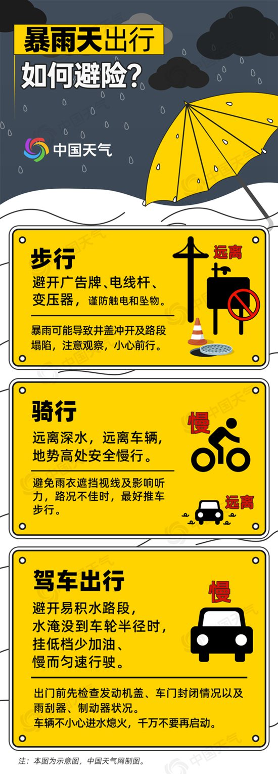 氣象部門提醒,本輪暴雨過程影響範圍廣,落區與前期強降雨落區有所重疊,中南部地區出現地質災害、山洪、中小河流洪水及城鄉積澇的風險較高,當地需加強防範,建議公眾及時關注預警預報信息,外出途經涉水路段儘量繞行,不要貿然通過。(來源:中國天氣網)