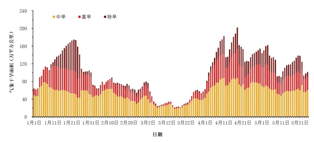 5月21日,中旱及以上面積達峯,其中陝甘寧豫晉5省(區)的特旱面積達35.1萬平方公里(圖4左)。近期,北方旱區大部出現小到中雨,局地大雨,氣象乾旱緩和。目前,西北地區東部、華中西北部等地仍存在中度及以上氣象乾旱,其中陝西南部、河南西部、甘肅南部等地為重旱,局地特旱(圖4右)。