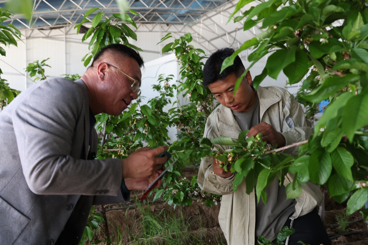 牛堯琪(左)在新建2號櫻桃棚記錄櫻桃結果轉色情況