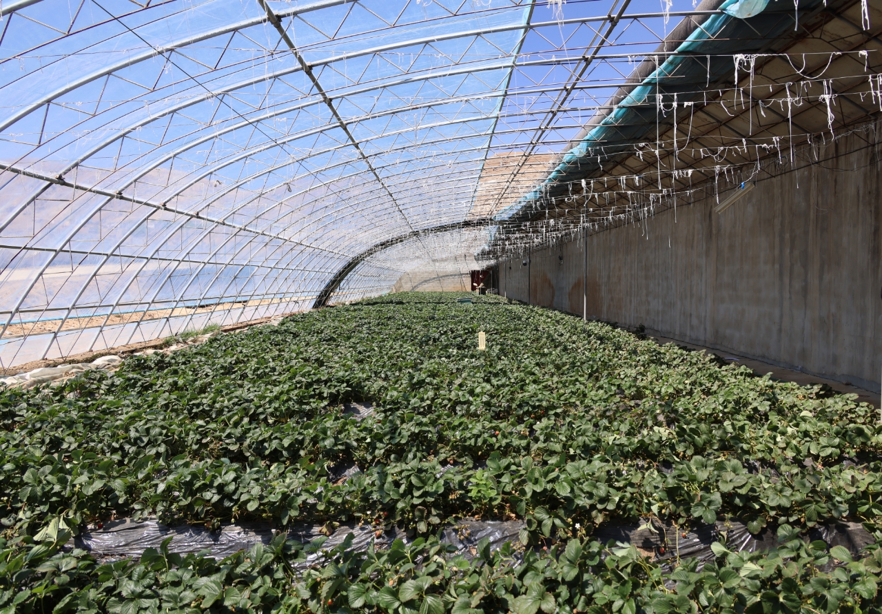 圖為牛堯琪在草莓大棚觀察草莓長勢