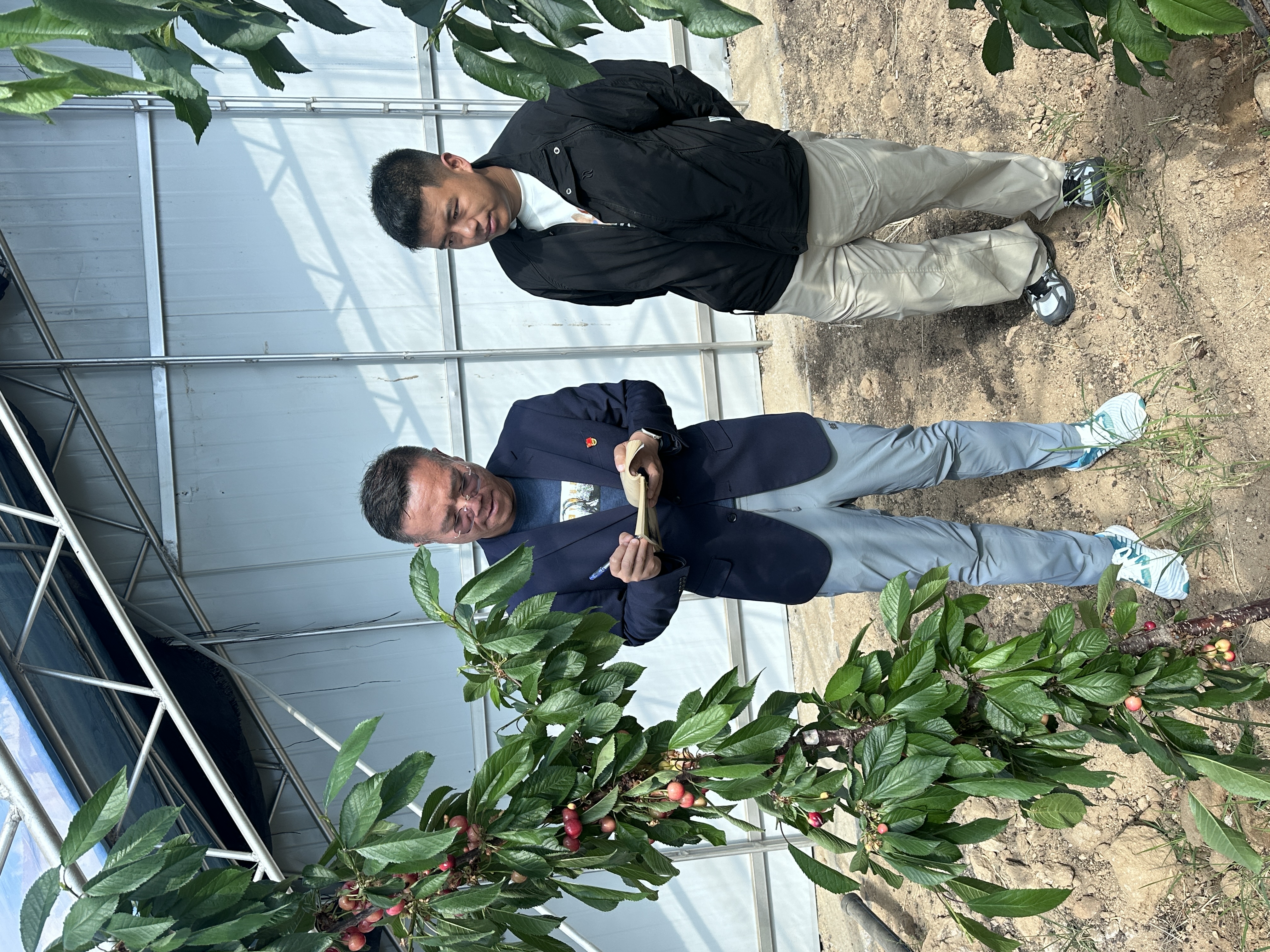 圖為牛堯琪(左)在櫻桃園觀察櫻桃長勢