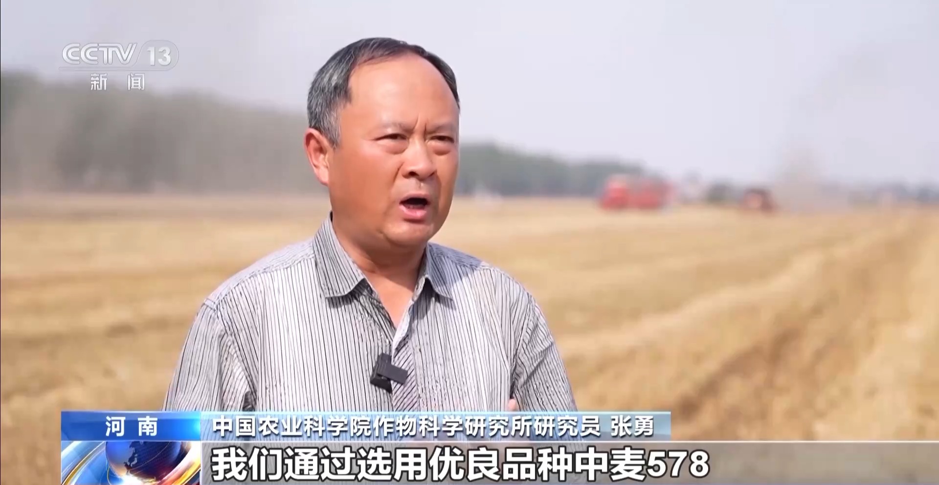 *中國農業科學院作物科學研究所研究員 張勇:*我們通過選用優良品種中麥578,通過適期的晚播,播前播後鎮壓,一噴三防,每畝比咱們的周邊地塊要增產200斤。