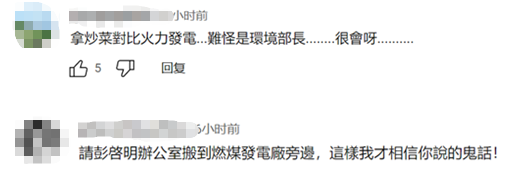 還有網友稱,“拿炒菜對比火力發電……難怪是‘環境部長’……很會呀……”“請彭啓明辦公室搬到燃煤發電廠旁邊,這樣我才相信你説的鬼話”!