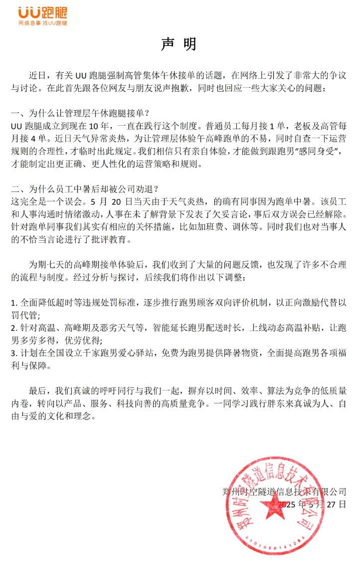 【環球網科技綜合報道】5月27日消息,近日有關UU 跑腿強制高管集體午休接單的話題,在網絡上引發關注和爭議。對此,UU跑腿發佈官方聲明稱,此舉是為讓管理層體驗午高峯跑單的不易,同時自查一下運營規則的合理性。
