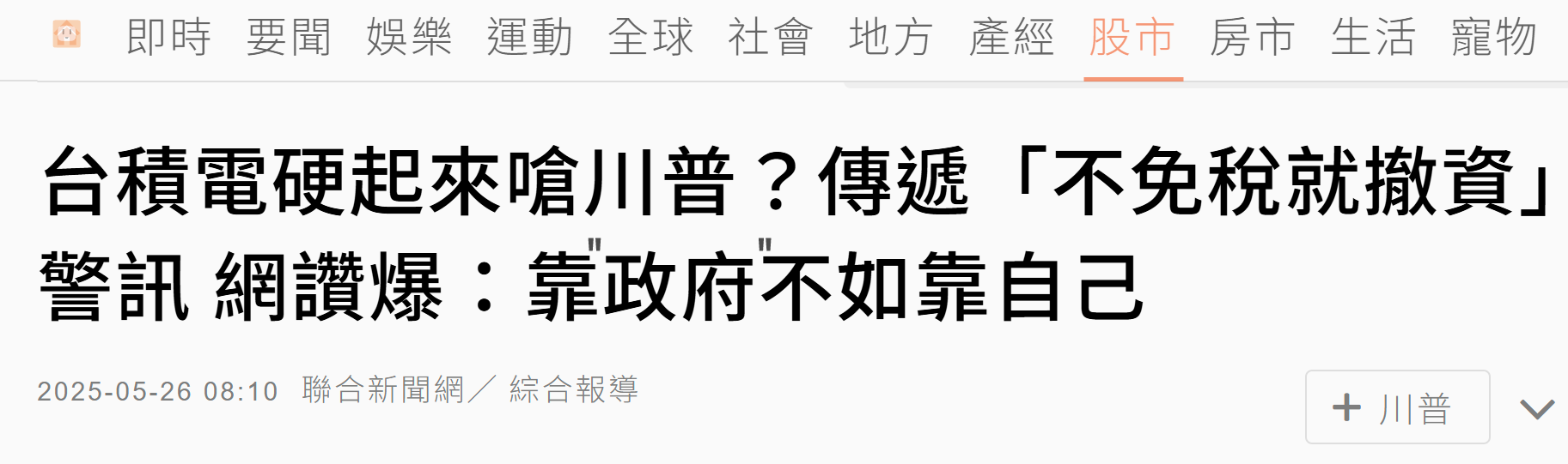 綜合台媒報道,針對美國擬恢復對半導體進口關税,台灣地區芯片生產商台積電近日首度公開致美國政府的意見函全文,警告若美方對芯片課徵關税,對美投資計劃恐受影響。函文曝光後引發島內熱議,台網友紛紛贊台積電“硬起來了”,同時對比、諷刺民進黨當局在此事上的軟弱態度。