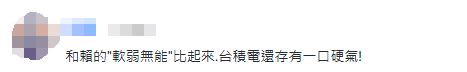 台積電“硬剛”美芯片關税,島內網友盛讚台積電的同時,也向“逢美必跪”的民進黨當局投去鄙夷的目光:“只會跪,只會聽音樂”,痛批民進黨當局動不動拿台積電當擋箭牌,自己只會一味軟弱跪舔,感嘆這樣的民進黨當局,台灣民眾要來何用,只會成為島內百姓與企業的悲哀。