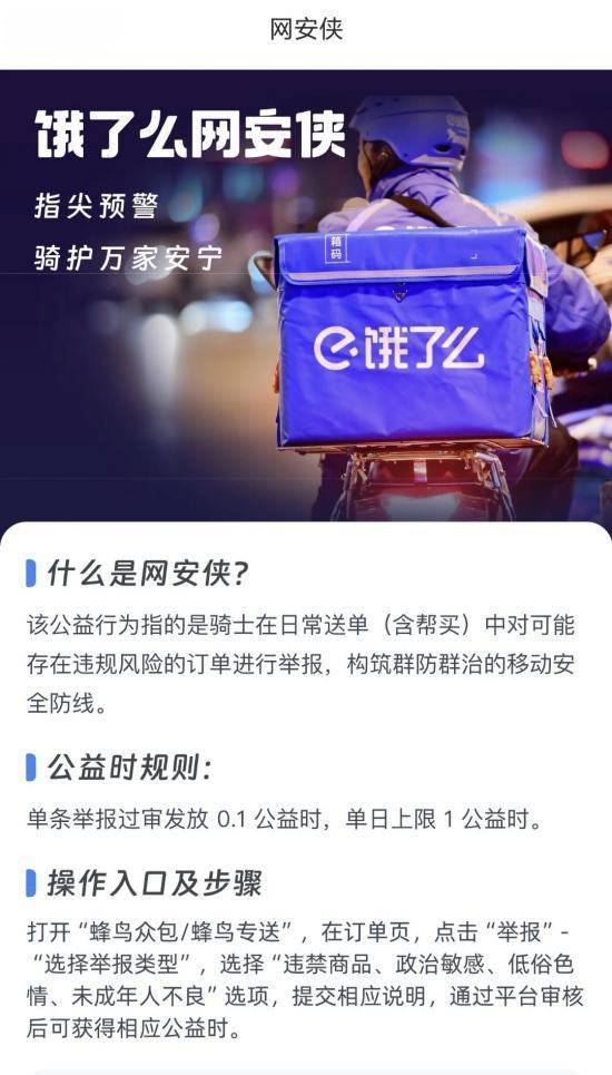 同時,餓了麼推出“藍騎士補位攔截公益獎勵機制”,藍騎士針對高風險“跑腿”訂單的舉報反映,通過平台審核後,可累計公益時長兑換裝備、生活物資等獎勵。