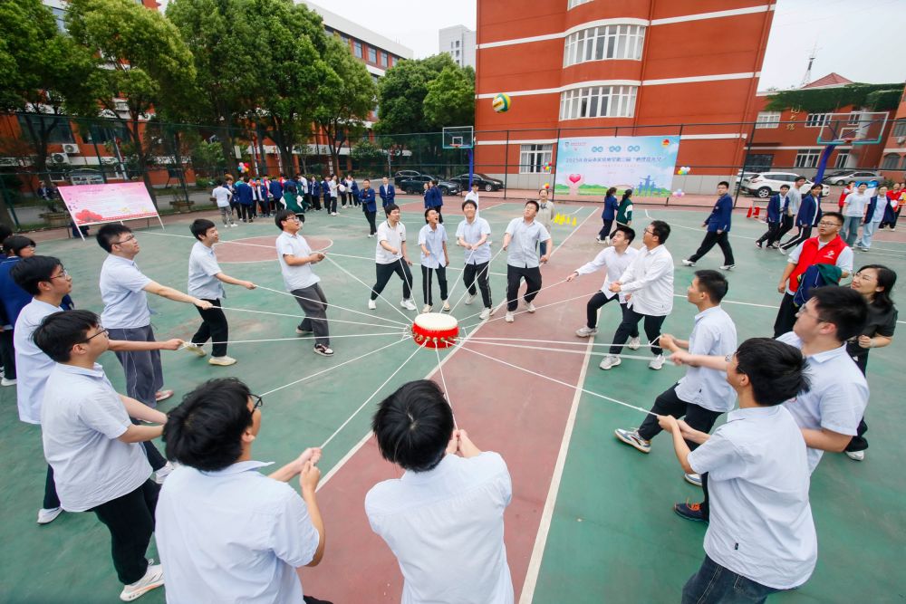 2025年5月22日,江蘇省海安市實驗中學高三學生在體驗“同心擊鼓”遊戲。高考臨近,各地學校組織高三學生開展不同形式的減壓活動,幫助學生放鬆心情,迎接高考。新華社發(顧彬斌 攝)