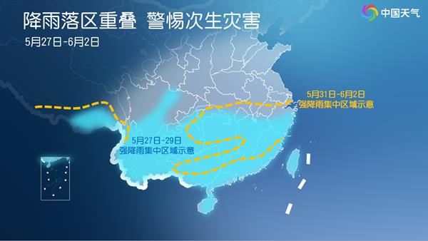 未來七天(5月27日至6月2日),南方兩輪大範圍降雨過程接踵而至,*湖南、廣東、廣西等多地雨水或持續打卡,部分地區在兩輪過程中會出現明顯降雨,*公眾請關注預警信息,加強防疊加降雨可能引發的次生災害。