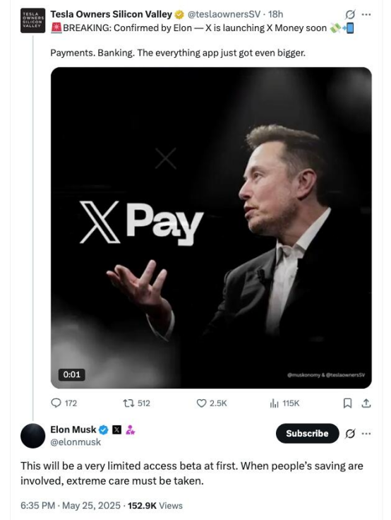 【環球網財經綜合報道】5月25日,馬斯克在X平台親自確認支付產品“X Money”最新進展,稱其正進行“最初的極其有限的內測版本”,並強調涉及人們儲蓄時必須格外小心。此前X Money官方賬號已透露該產品計劃2025年正式發佈,此次確認正值市場對其今年推出預期升温之際,今年1月平台代碼泄露就曾顯示該產品可能很快面世。
