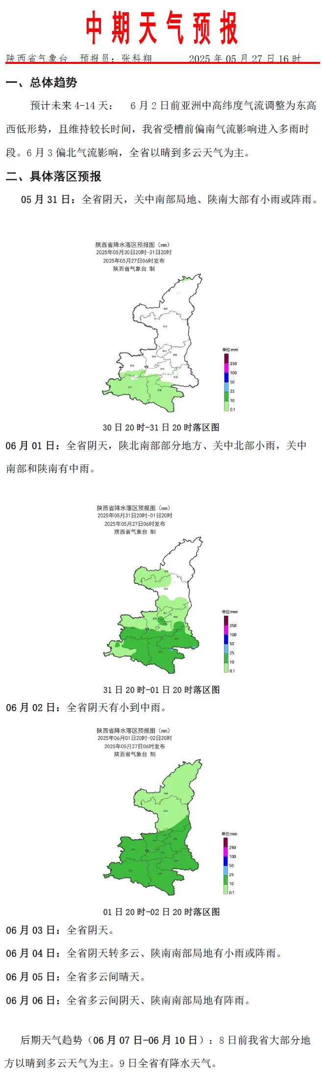 預計未來4-14天:6月2日前亞洲中高緯度氣流調整為東高西低形勢,且維持較長時間,*我省受槽前偏南氣流影響進入多雨時段。*6月3日受偏北氣流影響,全省以晴到多雲天氣為主。