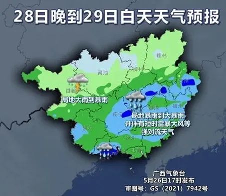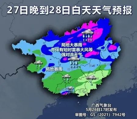 柳州市氣象台5月27日12時30分發布暴雨三級(黃色)預警:預計今晚(27日)到明天,全市有暴雨、局地大暴雨並伴有短時雷暴大風等強對流天氣。請注意防範。