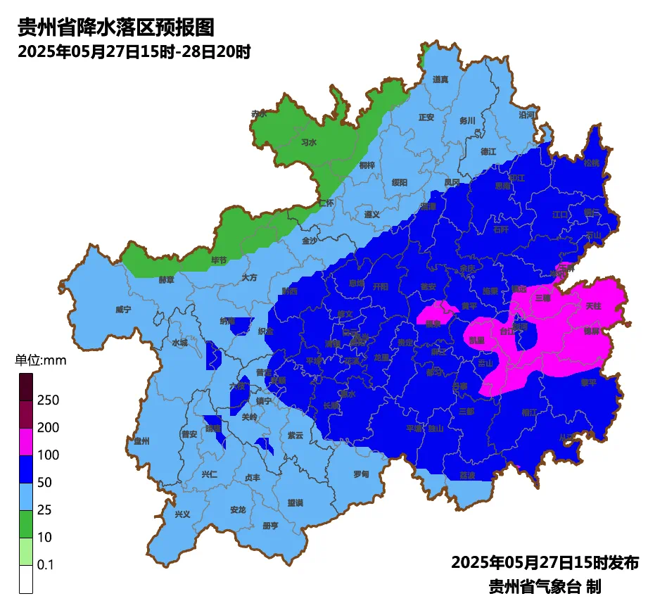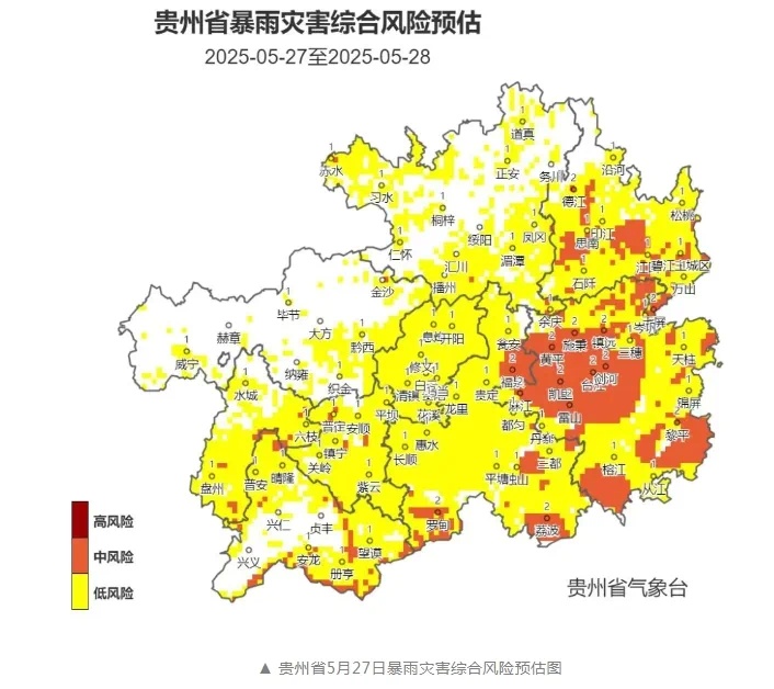 據貴州省氣象台預報,5月27日到28日,貴州省將迎來今年入汛以來最大範圍強降雨天氣過程。貴州省氣象局5月27日11時發佈暴雨黃色預警:預計5月27日11時至28日20時,貴陽市(所有區域),六盤水市東部(六枝、水城),遵義市東南部(播州、鳳岡、紅花崗、湄潭、餘慶),安順市(所有區域),畢節市南部(納雍、金沙、黔西、織金),銅仁市(除沿河外的所有區域),黔西南州(興仁、晴隆),黔東南州(所有區域),黔南州(所有區域)將出現暴雨(50~99毫米),其中銅仁市(玉屏),黔南州(福泉、甕安),黔東南州(除從江外的所有區域)局地將出現大暴雨(100~200毫米)。