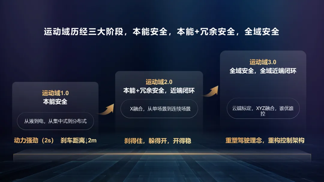 隨着新能源車應用場景的不斷豐富,對於新能源車整車安全性、乘坐的舒適性、駕駛的靈活性有了更高的要求。王超提到,運動域的發展歷程可分為三個階段:本能安全、本能+冗餘安全和全域安全。1.0階段,是從液壓控制到全面電動化,從集中式演進到分佈式控制階段; 2.0階段,顯著提高了汽車的行駛安全,汽車操控更絲滑。未來,面向3.0階段,將實現全域安全、全域近端閉環,通過XYZ深度融合顛覆傳統駕駛思維。