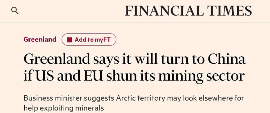據英國《金融時報》報道,丹麥格陵蘭島的自治政府日前表示,格陵蘭島方面希望與外國投資人合作開發當地的礦產資源。這其中包括美歐,但也不排除中方。
