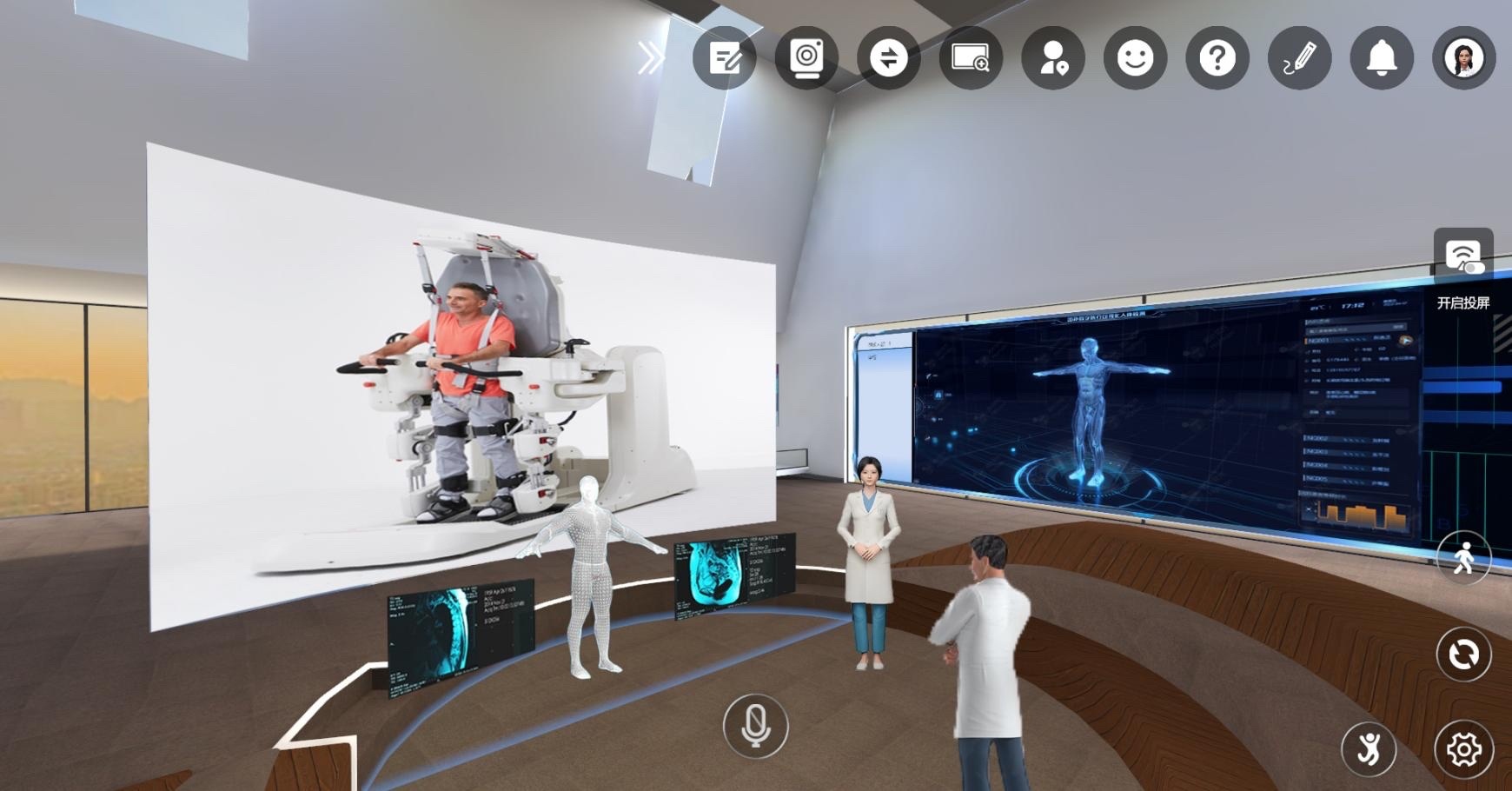“就像推開一扇通往平行世界的門,這種‘在場感’是傳統遠程協作難以企及的。”維賽客首席運營官徐晨翔邊演示邊解釋道。他調出了VS·work中的“智聯康復元診療平台”——這是維賽客在醫療元宇宙領域的創新應用,集成了病情診療、康復訓練、社交培訓等功能。在虛擬界面中,醫生可以通過高精度空間定位系統“走進”患者的虛擬診療室,患者則通過可穿戴設備完成肌力評估、平衡訓練等動作,數據即時反饋至醫生終端,為偏遠地區的患者提供了更加便捷、高效的診療服務。
